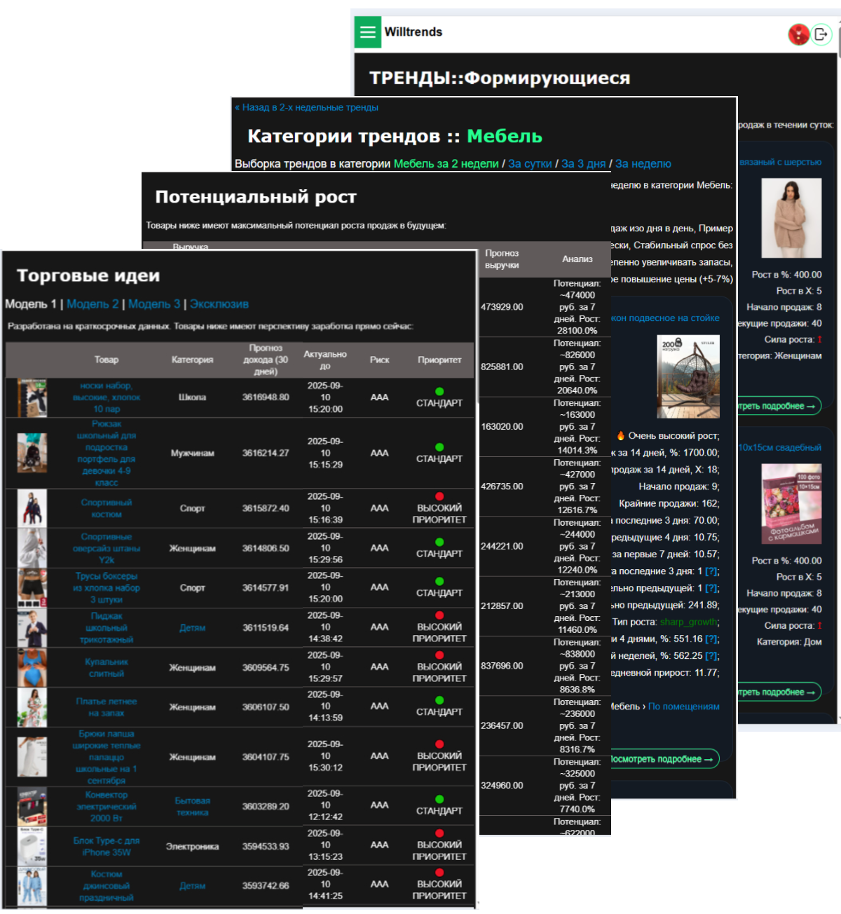 Анализ соцсетей, поисковых трендов, данных маркетплейсов, в результате даем готовые связки: товар + цена + прогноз дохода + срок актуальности